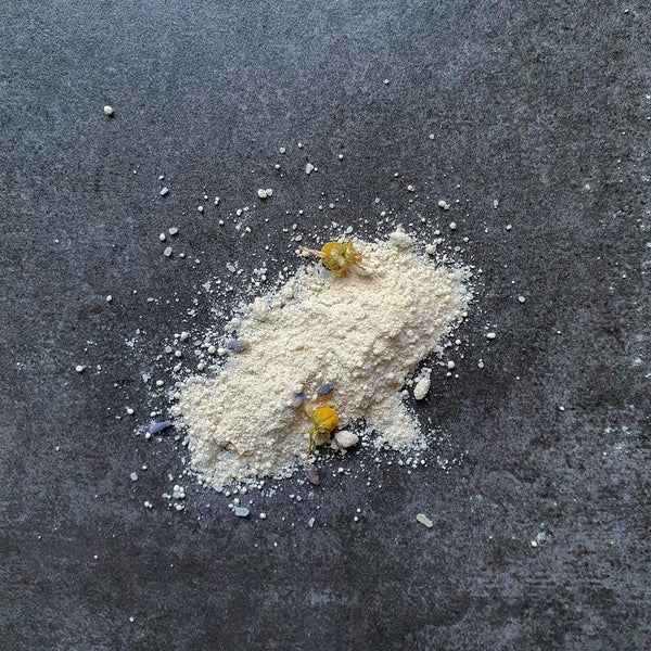 Colloidal Oatmeal, Epsom Salt, Fine Celtic Salt, White Kaolin French Clay, Chamomile Flowers*, Lavender Buds*, Calendula Petals* + Essential Oil Blend of Lavender*, Mandarin & Frankincense Olibanum.